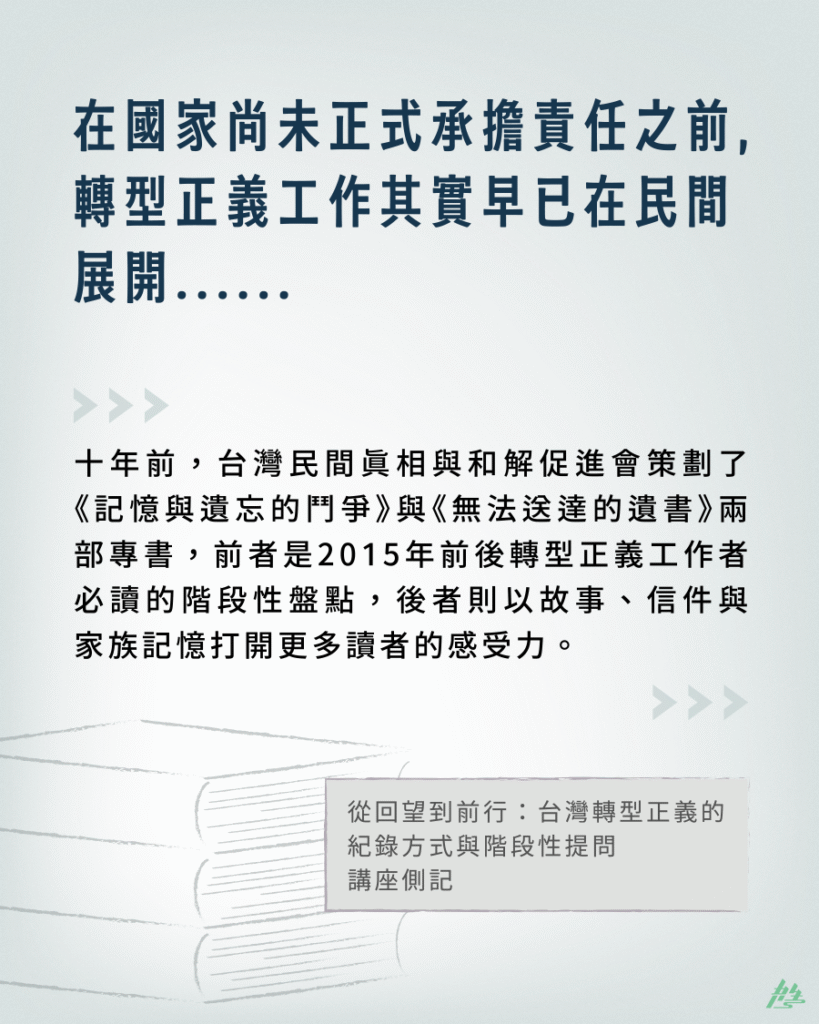 談台灣的轉型正義,往往很難只從制度、法律或單一事件說起。因為在國家尚未正式承擔責任之前,許多工作其實早已在民間默默展開——包括記憶的保存、受難者家屬的陪伴、檔案的追索,以及對「這段歷史到底該如何被理解」的公共提問。