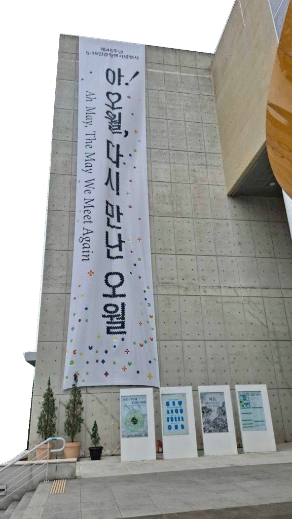 「Ah May, The May We Meet Again」是這次光州民主化運動四十五周年的主標語,我常常在街道上看到這片旗幟,寓意為「這個五月我們再次相見」。這一週多,感受到對於光州事件的描述,在血腥與悲情的那面之外,同樣強調市民互助、民主精神、公民集結起來的能動性,以及這份悲傷與憤怒帶來的力量跟見證。身在其中不會只感受到被害的悲情,而是有種「這群市民保衛了自己的民主」的那種精神,每個市民都在其中貢獻了自己的力量。我想,這條錦南路,是因為「在這裡的人們的記憶」而產生意義的,而紀念儀式就是一種傳承的過程。