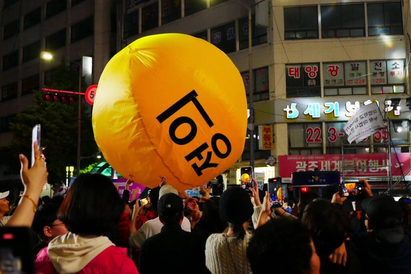 5 月 17 日的晚上,是到達光州的第一天,錦南路1已封路,整條街道一直到 5·18 民主廣場都是 5·18 的前夜祭活動,雙面舞台、環形螢幕、整條街道延伸到廣場都擠滿人,很多人坐在大街上、靠在騎樓間,人潮時而吶喊、時而屏氣凝神,旁邊的旗幟也隨著音樂節奏與短劇表演揮舞著。